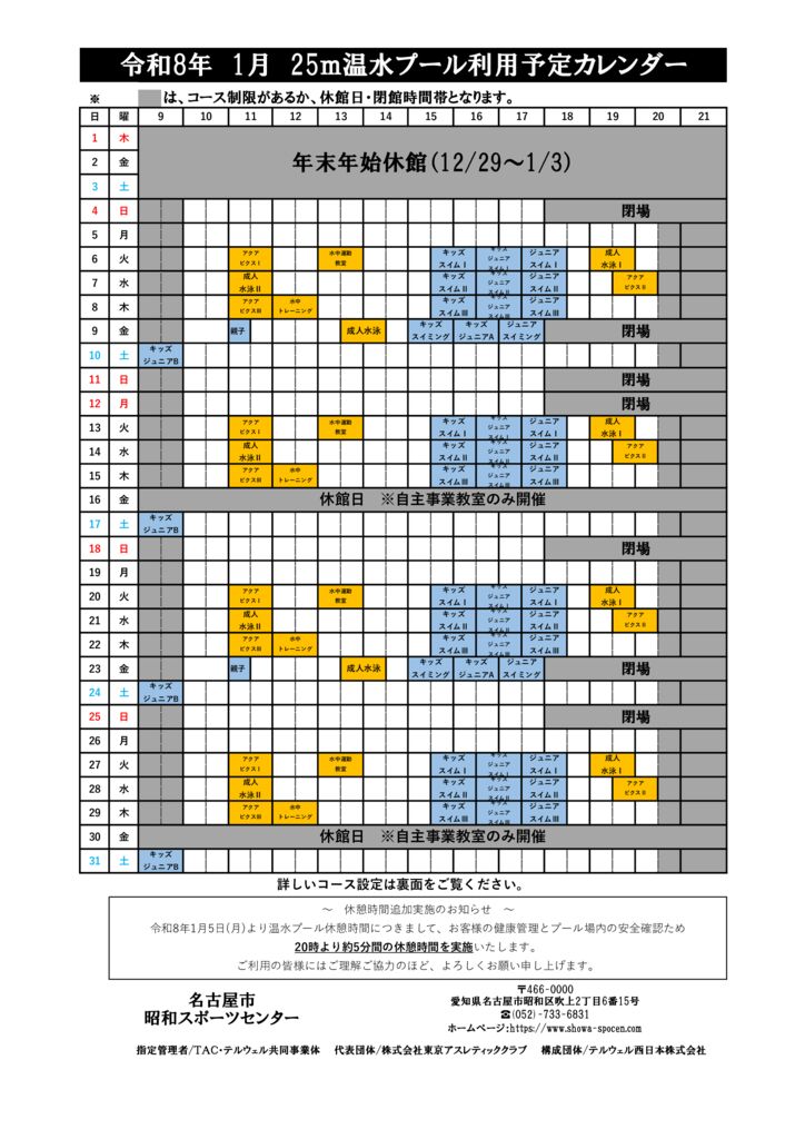【お知らせ】令和8年1月 大会予定表・ランニングコース予定表・駐車場混雑状況・プールコース状況