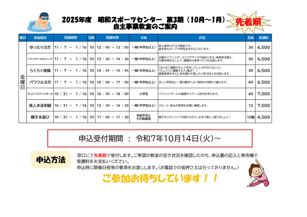 【教室募集のお知らせ】第3期(11月~1月) 金曜日 自主事業教室募集のお知らせ